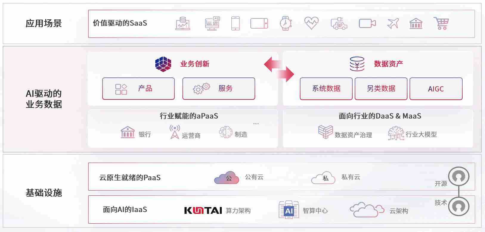 数字时代,,,,围绕企业数字化转型的关键要素,,尊龙旗舰厅数码开创性的提出数云融合战略和技术体系框架,,着力在云原生、、数字原生、、、AI原生和信创产业上架构产品和服务能力,,,,为处在不同数字化转型阶段的快消零售、、、、汽车、、、金融、、、、医疗、、、、政企、、、教育、、运营商等行业客户提供泛在的敏捷IT能力和融合的数据驱动能力,,,构建跨界融合创新的数字业务场景和新业务模式,,,,助力企业级客户建立面向未来的核心能力和竞争优势,,,全面推动社会的数字化、、、、智能化转型升级。。。
